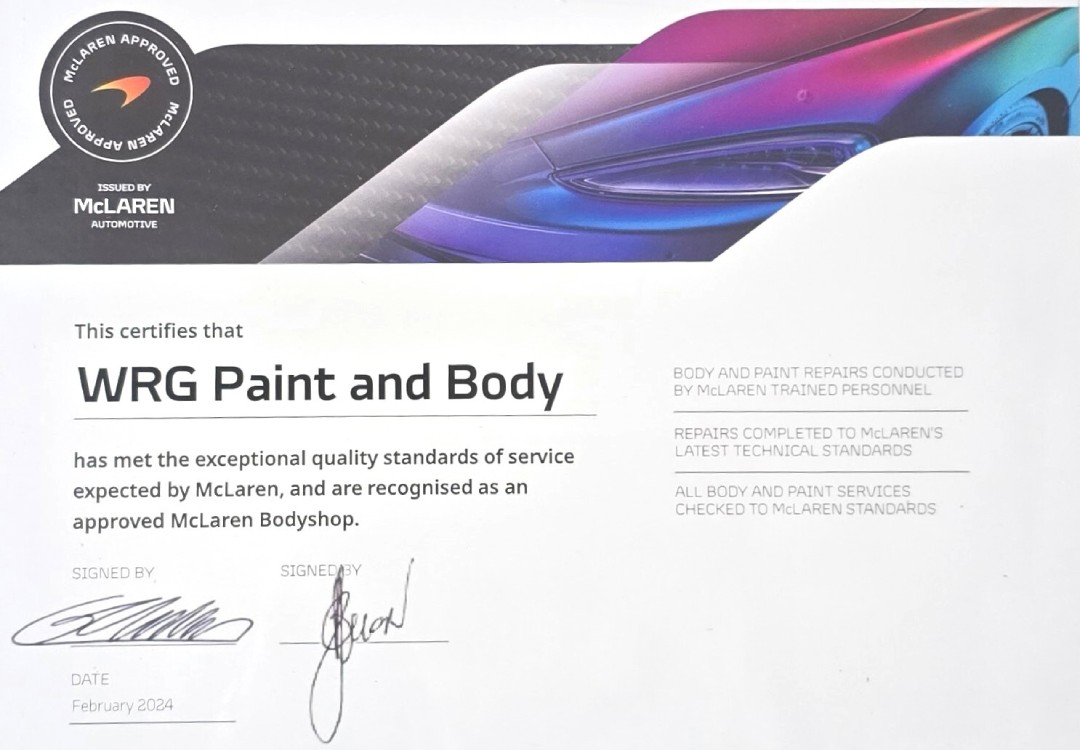 WRG PAINT AND BODY has met the exceptional quality standards of service expected by McLaren and are recognized as an approved McLaren Body shop. You can count on our McLaren Certified body shop to deliver the best quality service, from paint touch-ups to major collision / paint repairs.